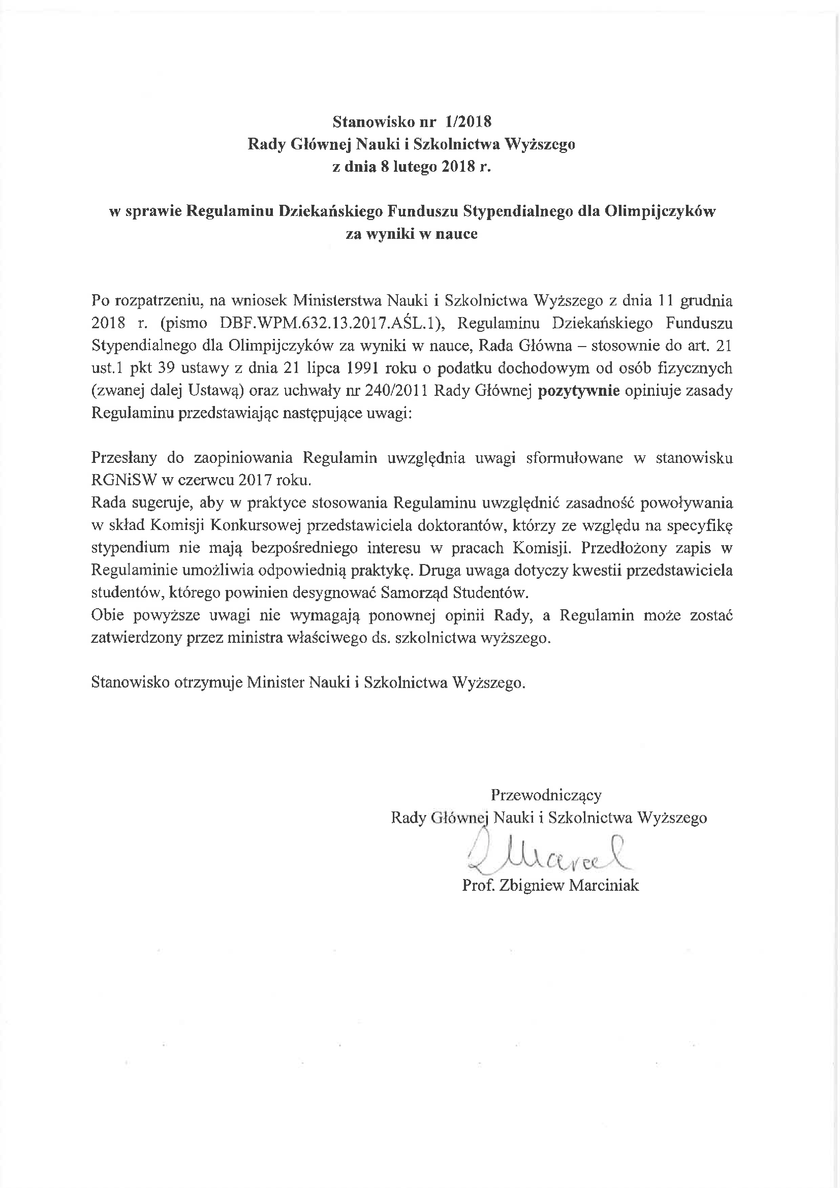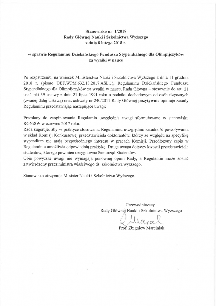 Stanowisko nr 1/2018 Rady Głównej Nauki i Szkolnictwa Wyższego z dnia 8 lutego 2018 r. w sprawie Regulaminu Dziekańskiego Funduszu Stypendialnego dla Olimpijczyków za wyniki w nauce