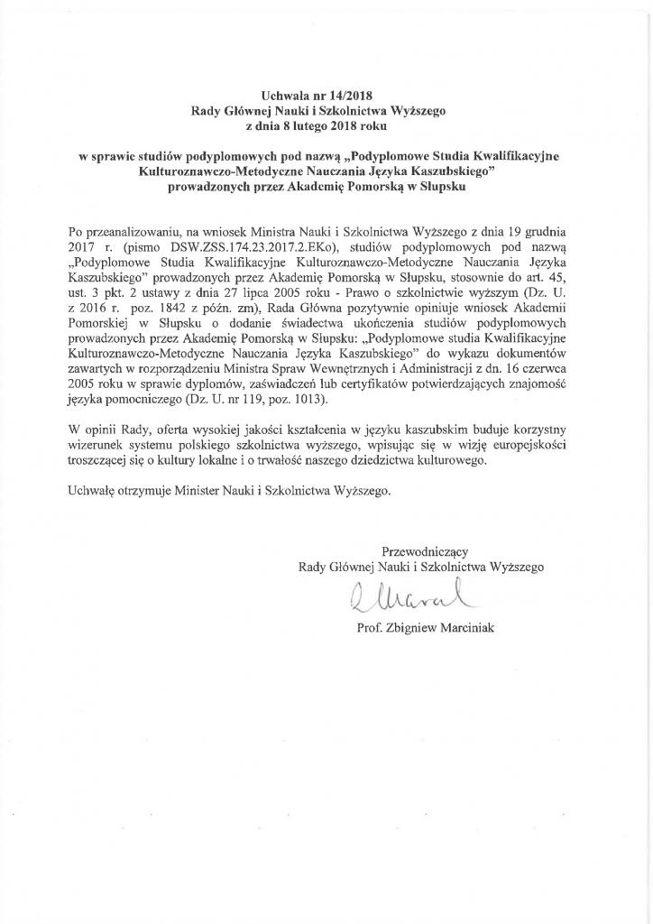 Uchwała nr 14/2018 Rady Głównej Nauki i Szkolnictwa Wyższego z dnia 8 lutego 2018 roku w sprawie studiów podyplomowych pod nazwą „Podyplomowe Studia Kwalifikacyjne Kulturoznawczo-Metodyczne Nauczania Języka Kaszubskiego” prowadzonych przez Akademię Pomorską Słupsku