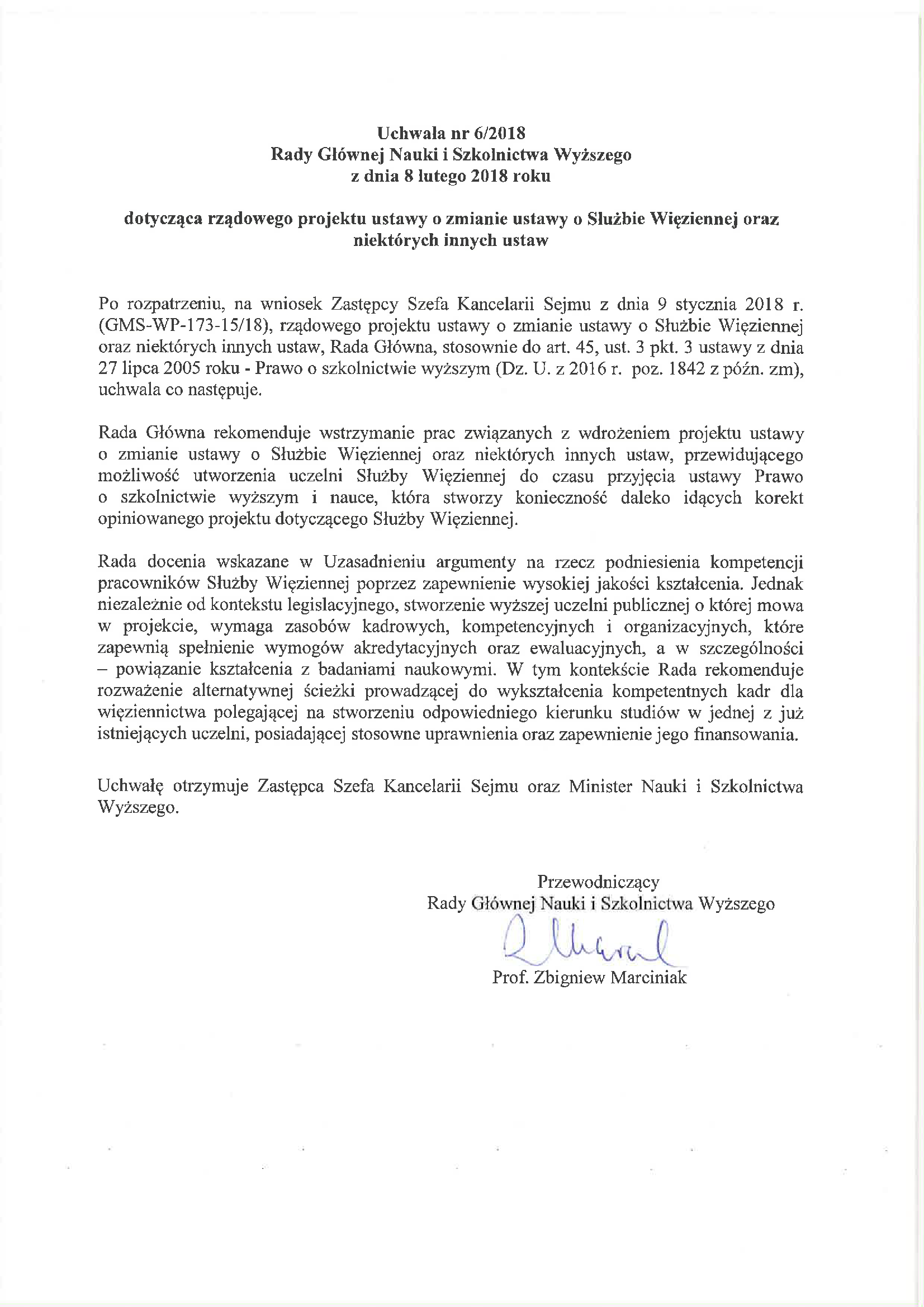 Uchwała nr 6/2018 Rady Głównej Nauki i Szkolnictwa Wyższego z dnia 8 lutego 2018 roku dotycząca rządowego projektu ustawy o zmianie ustawy o Służbie Więziennej oraz niektórych innych ustaw