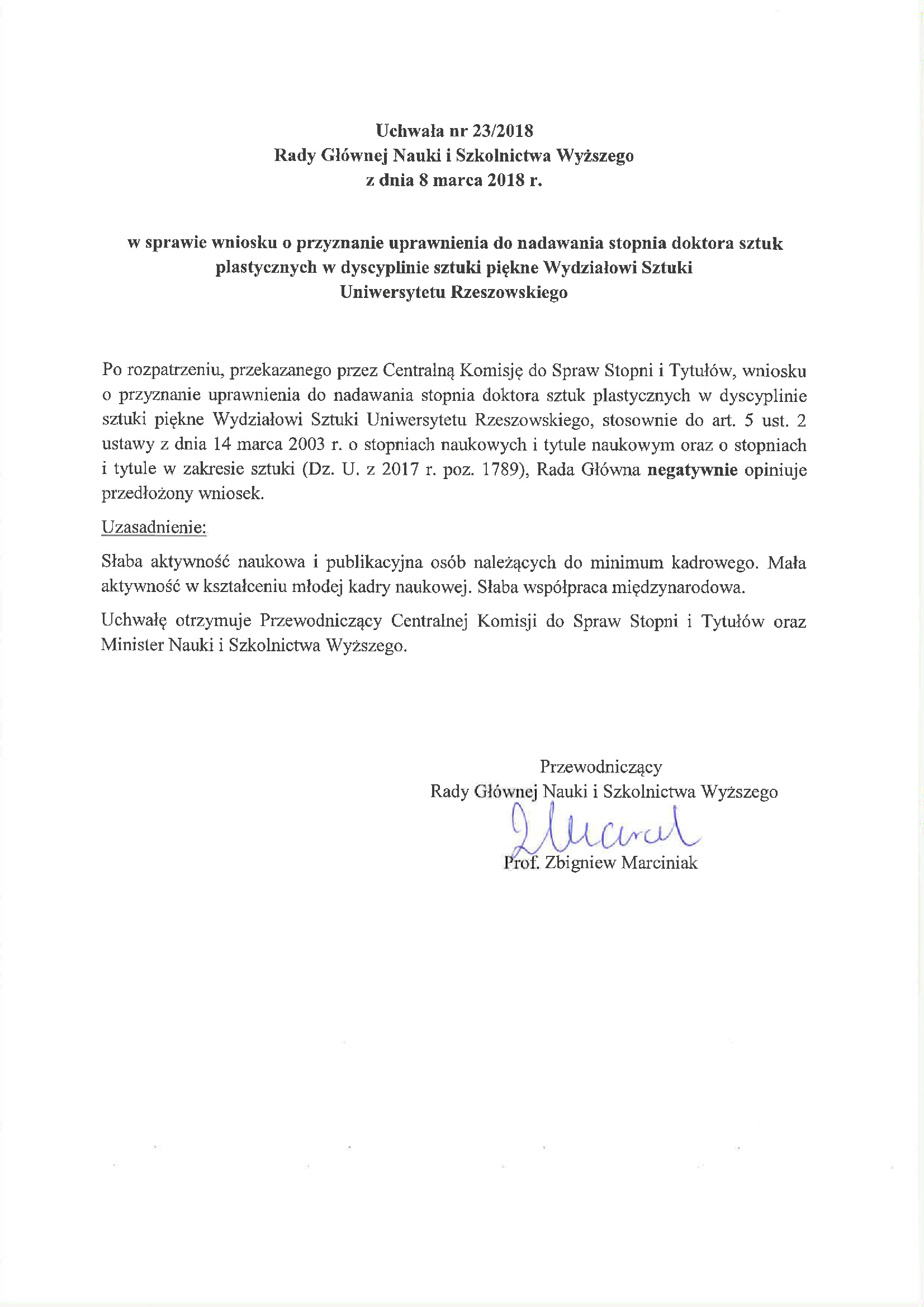 Uchwała nr 23/2018 Rady Głównej Nauki i Szkolnictwa Wyższego z dnia 8 marca 2018 r. w sprawie wniosku o przyznanie uprawnienia do nadawania stopnia doktora sztuk plastycznych w dyscyplinie sztuki piękne Wydziałowi Sztuki Uniwersytetu Rzeszowskiego