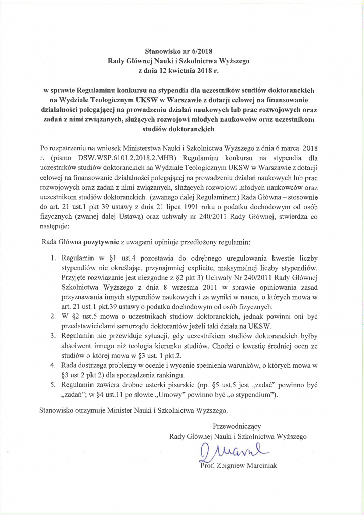 Stanowisko nr 6/2018 Rady Głównej Nauki i Szkolnictwa Wyższego z dnia 12 kwietnia 2018 r. w sprawie Regulaminu konkursu na stypendia dla uczestników studiów doktoranckich na Wydziale Teologicznym UKSW w Warszawie z dotacji celowej na finansowanie działalności polegającej na prowadzeniu działań naukowych lub prac rozwojowych oraz zadań z nimi związanych, służących rozwojowi młodych naukowców oraz uczestnikom studiów doktoranckich