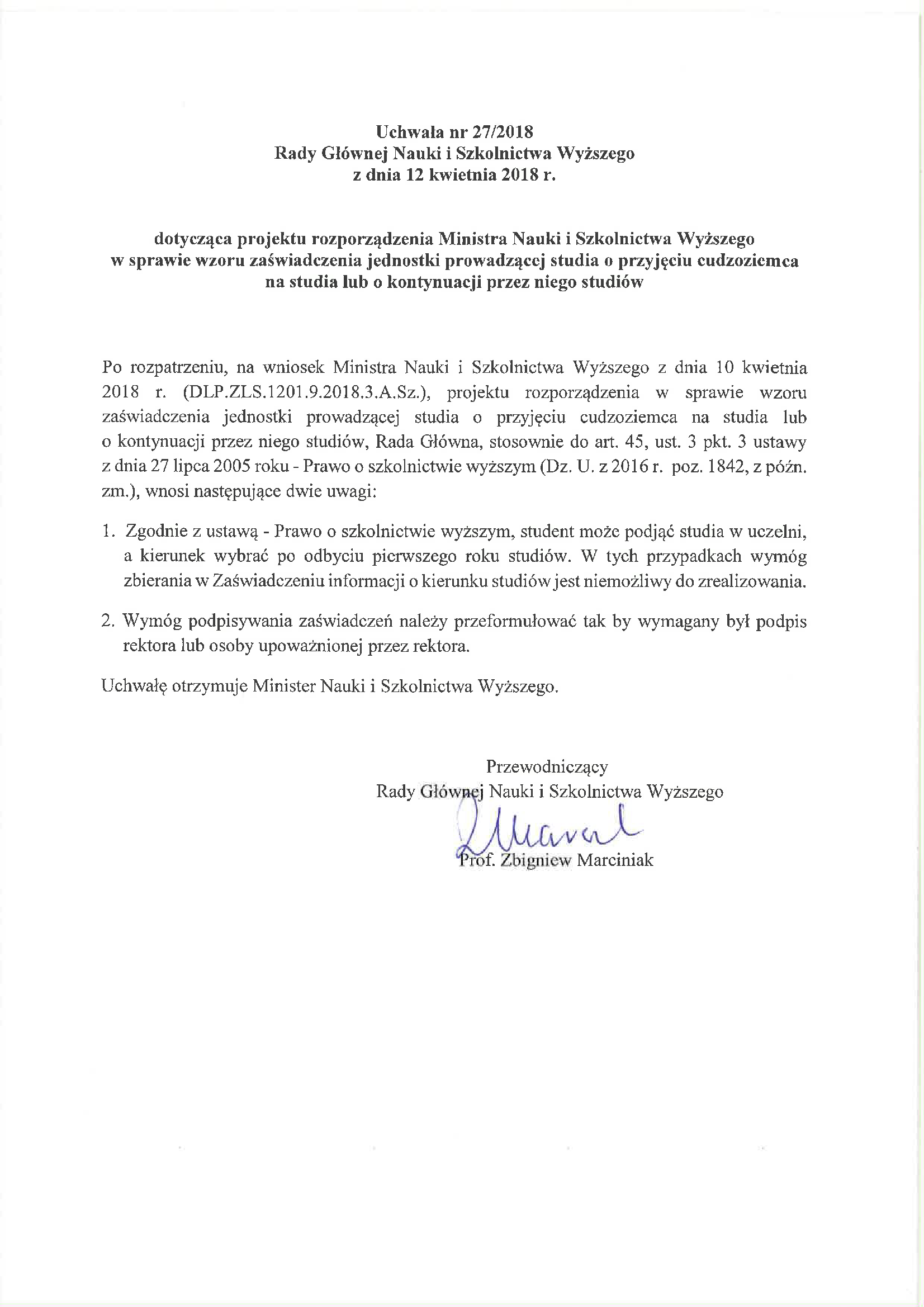 Uchwała nr 27/2018 Rady Głównej Nauki i Szkolnictwa Wyższego z dnia 12 kwietnia 2018 r. dotycząca projektu rozporządzenia Ministra Nauki i Szkolnictwa Wyższego w sprawie wzoru zaświadczenia jednostki prowadzącej studia o przyjęciu cudzoziemca na studia lub o kontynuacji przez niego studiów