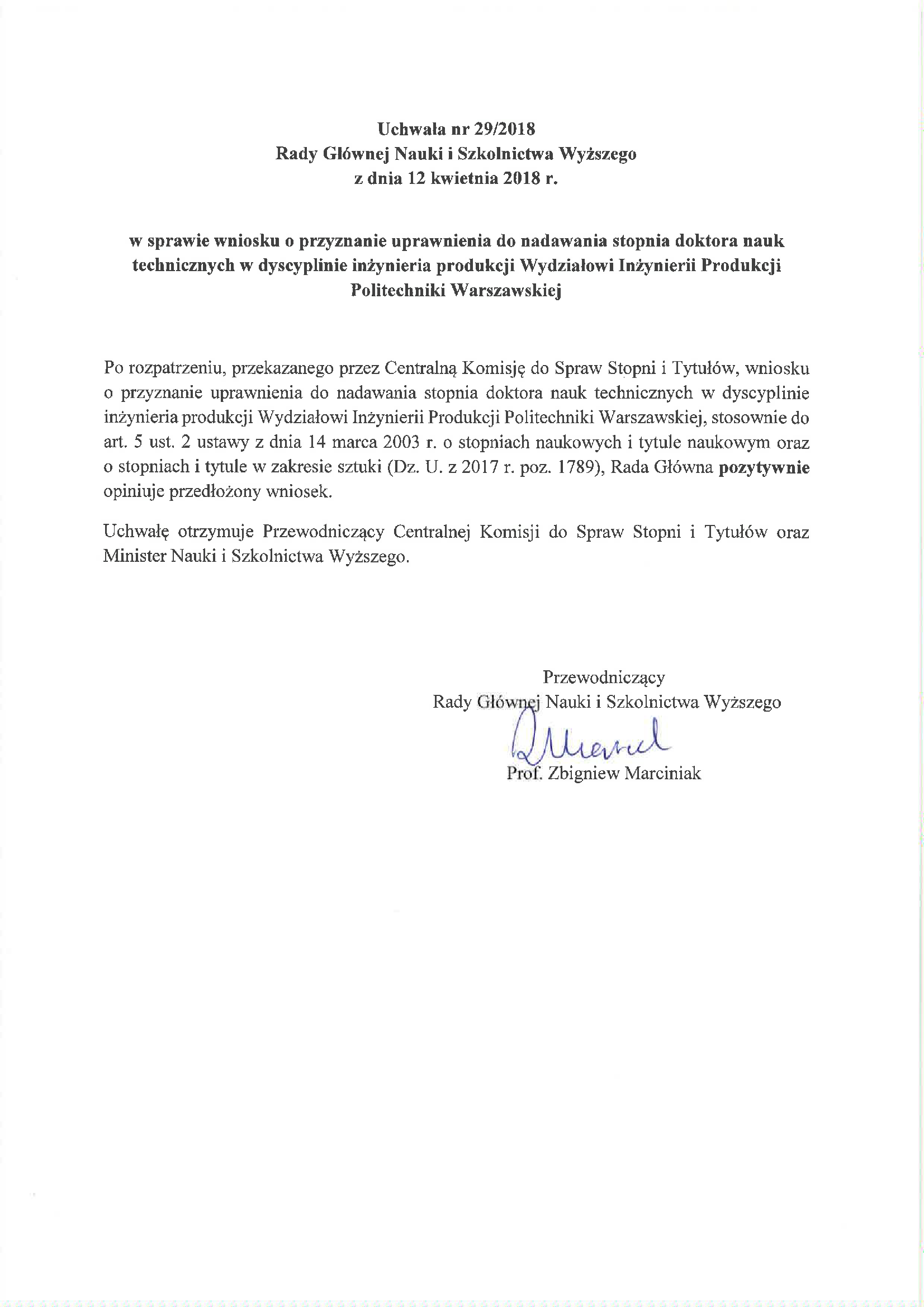 Uchwała nr 29/2018 Rady Głównej Nauki i Szkolnictwa Wyższego z dnia 12 kwietnia 2018 r. w sprawie wniosku o przyznanie uprawnienia do nadawania stopnia doktora nauk technicznych w dyscyplinie inżynieria produkcji Wydziałowi Inżynierii Produkcji Politechniki Warszawskiej
