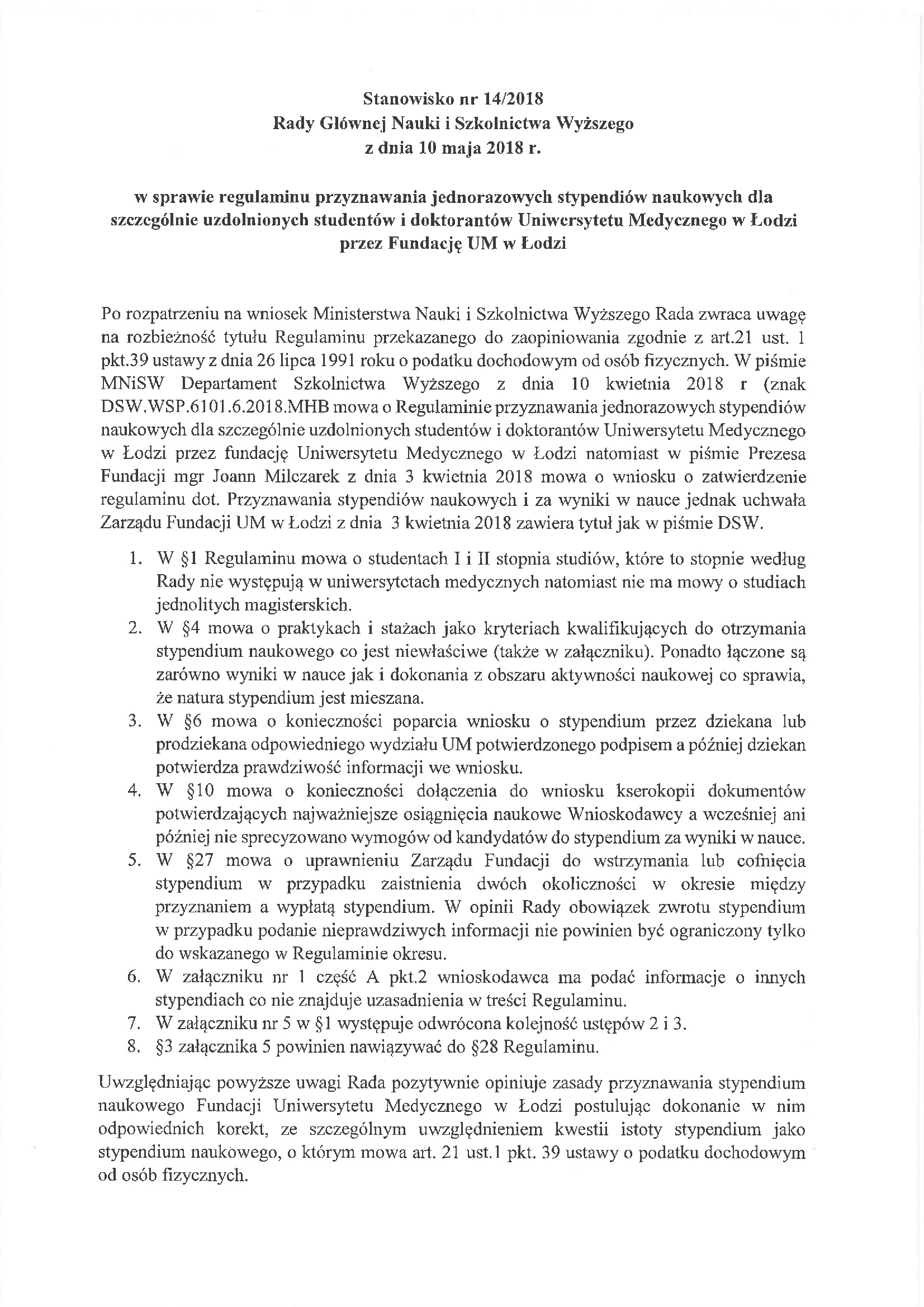 Stanowisko nr 14/2018 Rady Głównej Nauki i Szkolnictwa Wyższego z dnia 10 maja 2018 r. w sprawie regulaminu przyznawania jednorazowych stypendiów naukowych dla szczególnie uzdolnionych studentów i doktorantów Uniwersytetu Medycznego w Łodzi przez Fundację UM w Łodzi