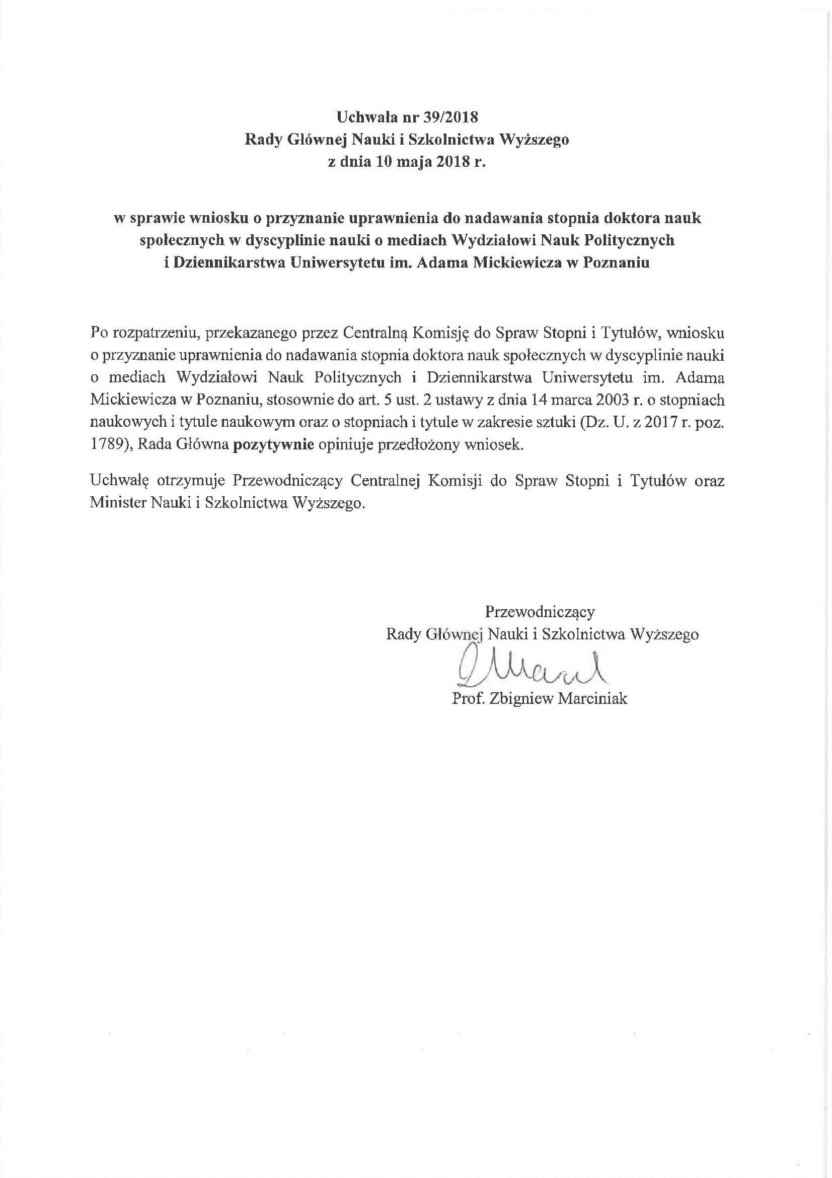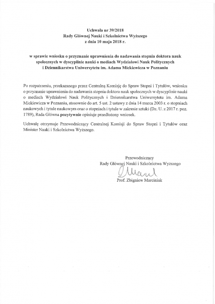 Uchwała nr 39/2018 Rady Głównej Nauki i Szkolnictwa Wyższego z dnia 10 maja 2018 r. w sprawie wniosku o przyznanie uprawnienia do nadawania stopnia doktora nauk społecznych w dyscyplinie nauki o mediach Wydziałowi Nauk Politycznych i Dziennikarstwa Uniwersytetu im. Adama Mickiewicza w Poznaniu