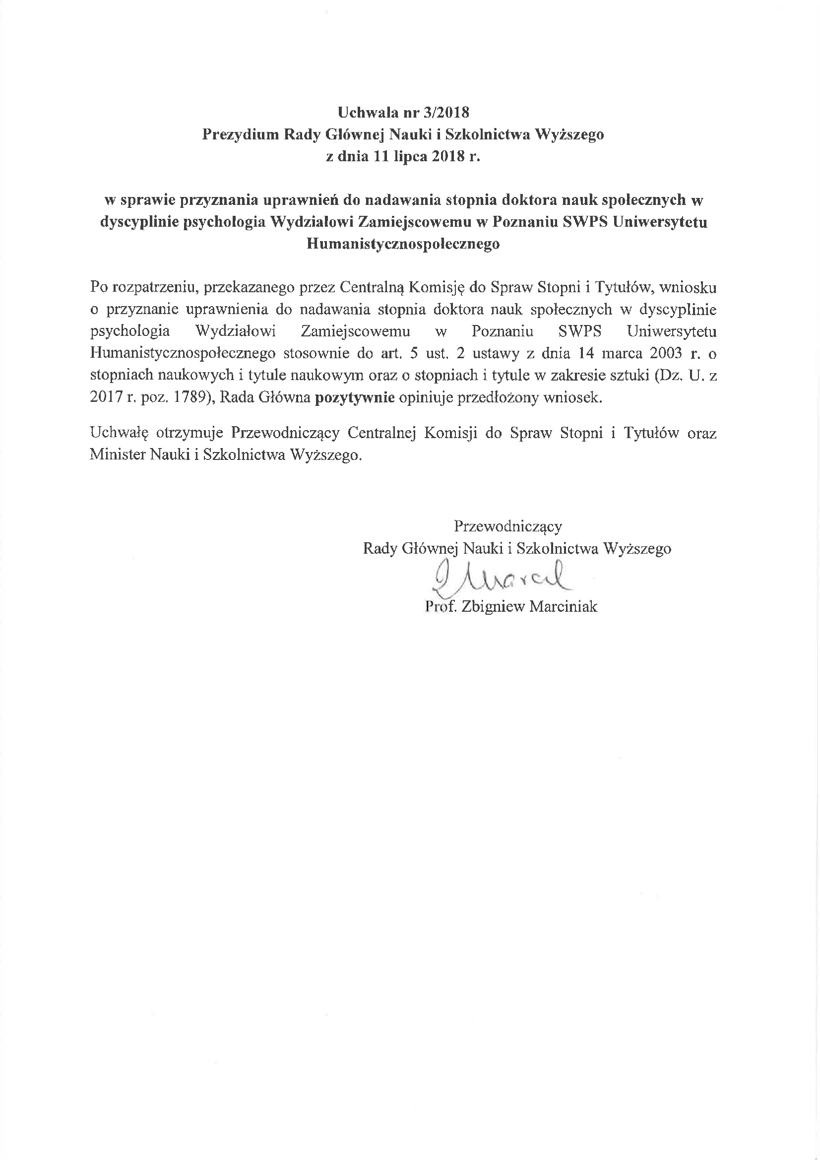 Uchwała nr 3/2018 Prezydium Rady Głównej Nauki i Szkolnictwa Wyższego z dnia 11 lipca 2018 r. w sprawie przyznania uprawnień do nadawania stopnia doktora nauk społecznych w dyscyplinie psychologia Wydziałowi Zamiejscowemu w Poznaniu SWPS Uniwersytetu Humanistycznospołecznego