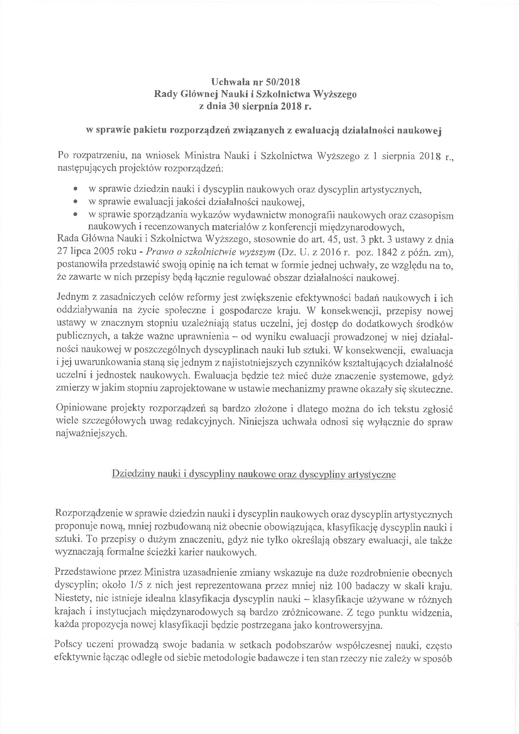 Uchwała nr 50/2018 Rady Głównej Nauki i Szkolnictwa Wyższego z dnia 30 sierpnia 2018 r. w sprawie pakietu rozporządzeń związanych z ewaluacją działalności naukowej