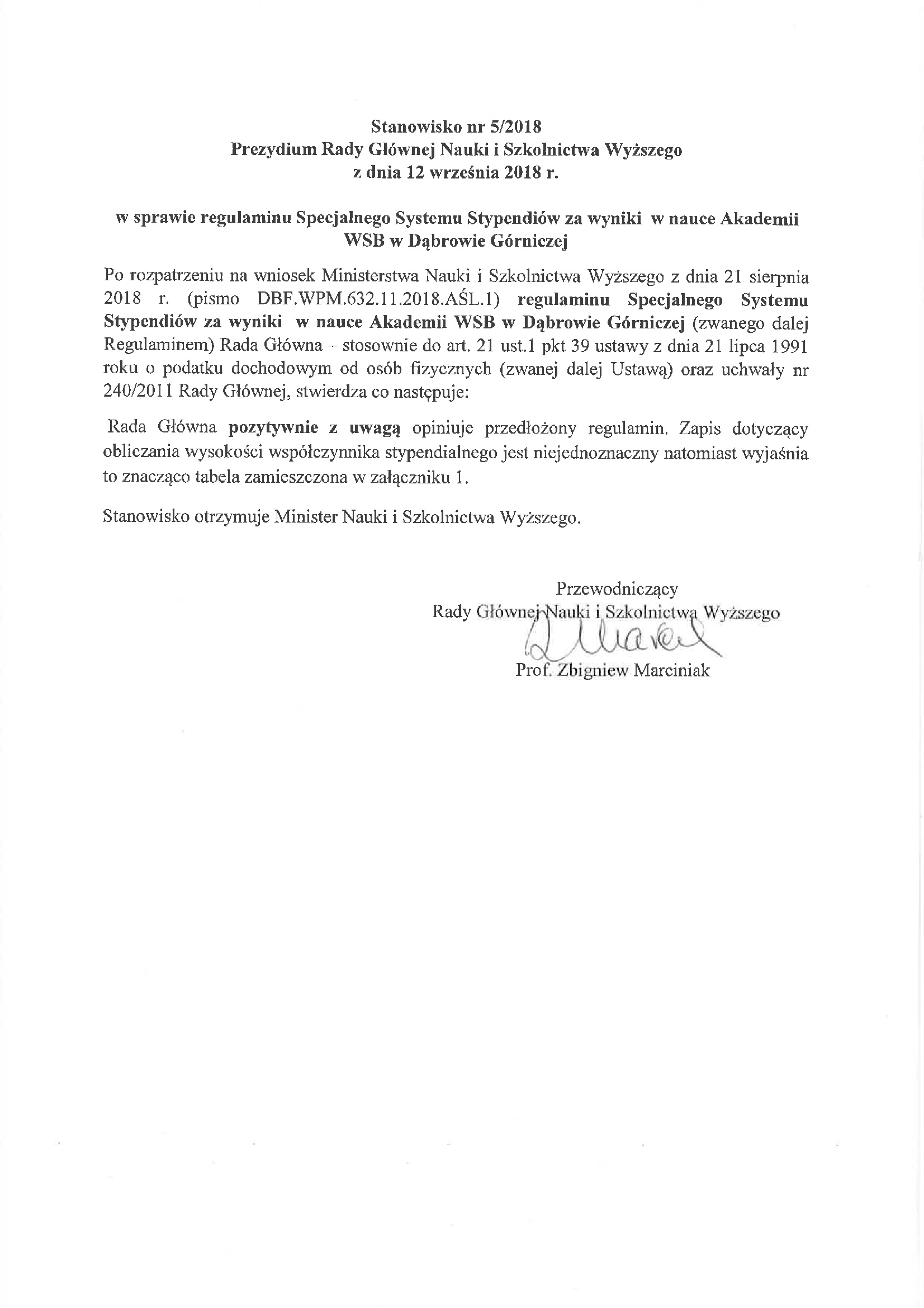Stanowisko nr 5/2018 Prezydium Rady Głównej Nauki i Szkolnictwa Wyższego z dnia 12 września 2018 r. w sprawie regulaminu Specjalnego Systemu Stypendiów za wyniki w nauce Akademii WSB w Dąbrowie Górniczej