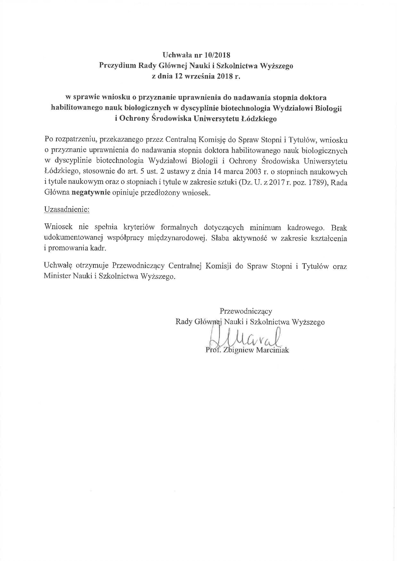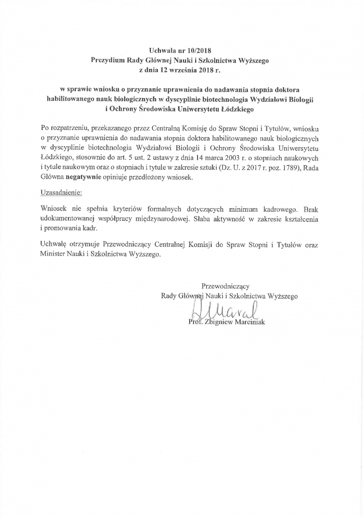 Uchwała nr 10/2018 Prezydium Rady Głównej Nauki i Szkolnictwa Wyższego z dnia 12 września 2018 r. w sprawie wniosku o przyznanie uprawnienia do nadawania stopnia doktora habilitowanego nauk biologicznych w dyscyplinie biotechnologia Wydziałowi Biologii i Ochrony Środowiska Uniwersytetu Łódzkiego