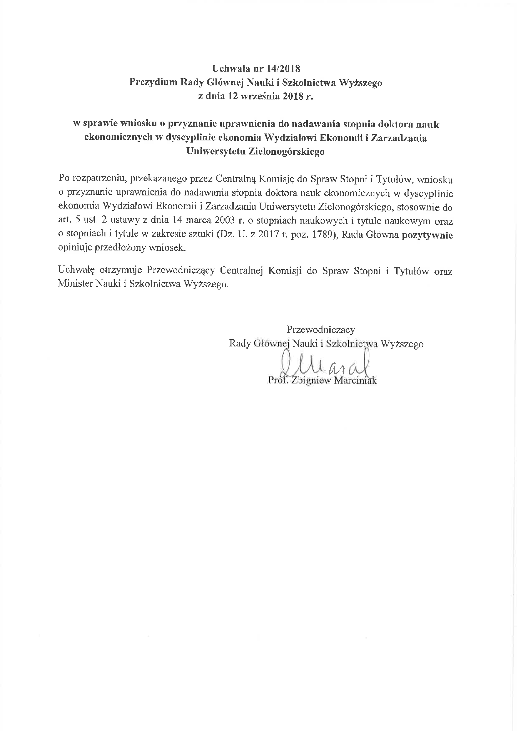 Uchwała nr 14/2018 Prezydium Rady Głównej Nauki i Szkolnictwa Wyższego z dnia 12 września 2018 r. w sprawie wniosku o przyznanie uprawnienia do nadawania stopnia doktora nauk ekonomicznych w dyscyplinie ekonomia Wydziałowi Ekonomii i Zarządzania Uniwersytetu Zielonogórskiego