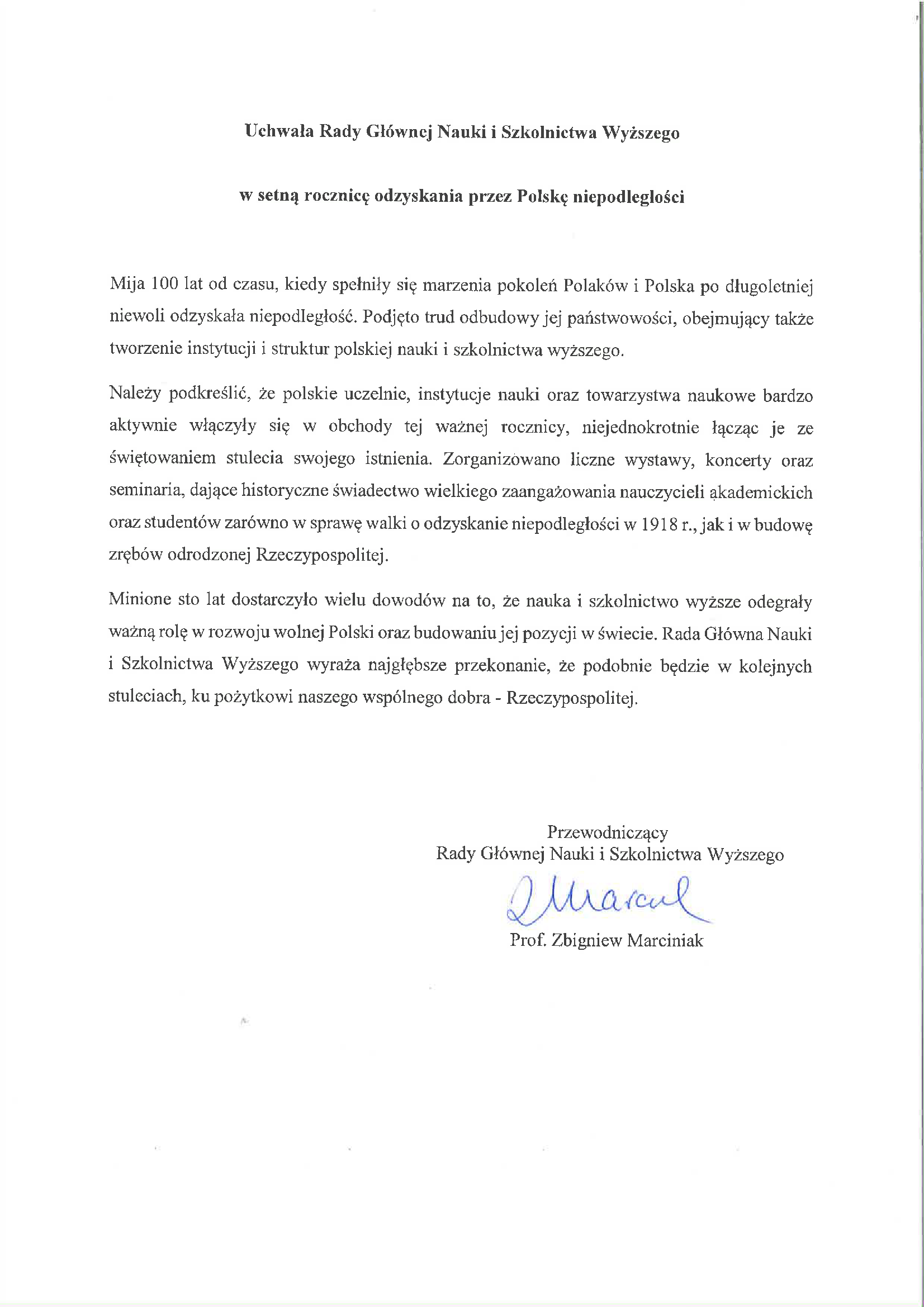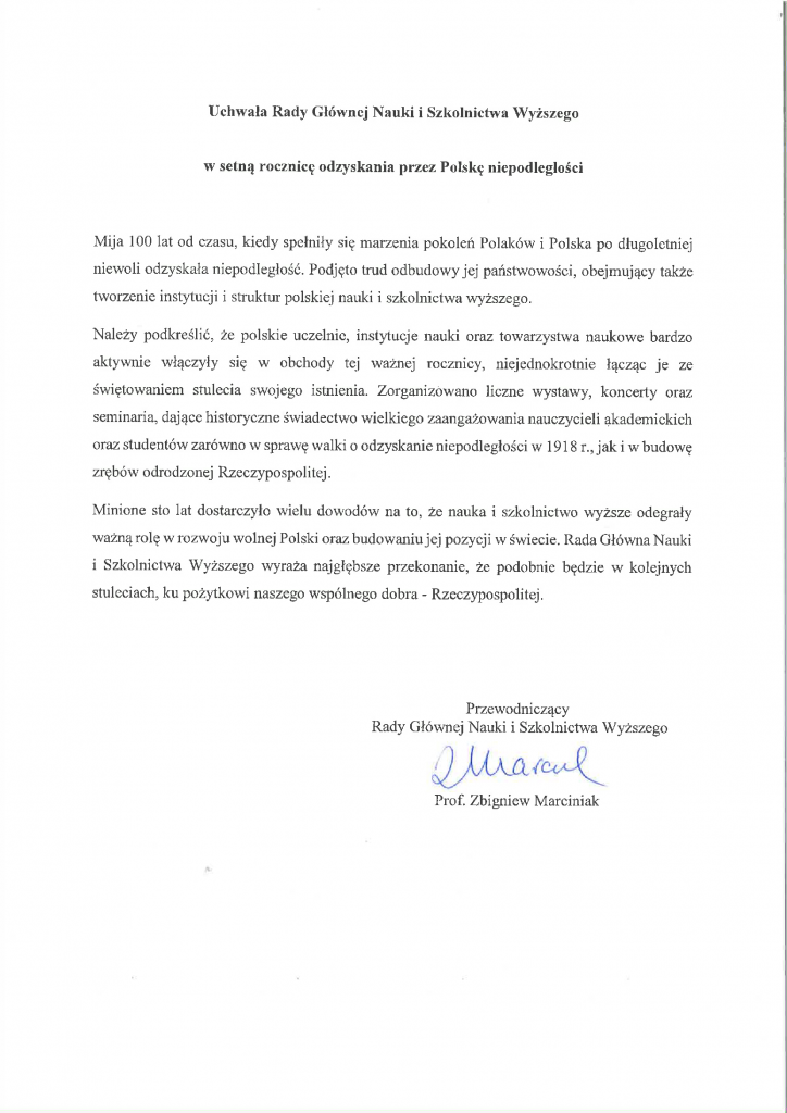 Uchwała Rady Głównej Nauki i Szkolnictwa Wyższego w setną rocznicę odzyskania przez Polskę niepodległości