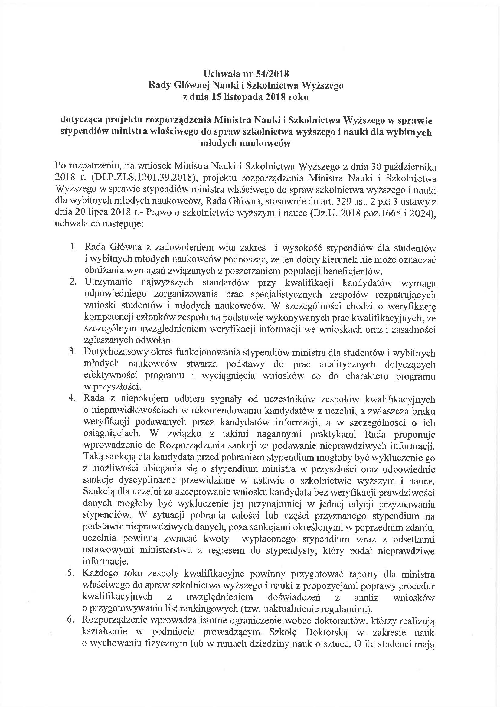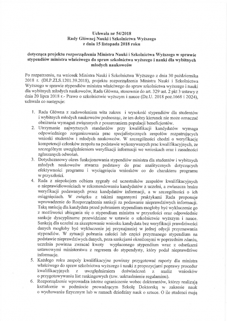 Uchwała nr 54/2018 Rady Głównej Nauki i Szkolnictwa Wyższego z dnia 15 listopada 2018 roku dotycząca projektu rozporządzenia Ministra Nauki i Szkolnictwa Wyższego w sprawie stypendiów ministra właściwego do spraw szkolnictwa wyższego i nauki dla wybitnych młodych naukowców