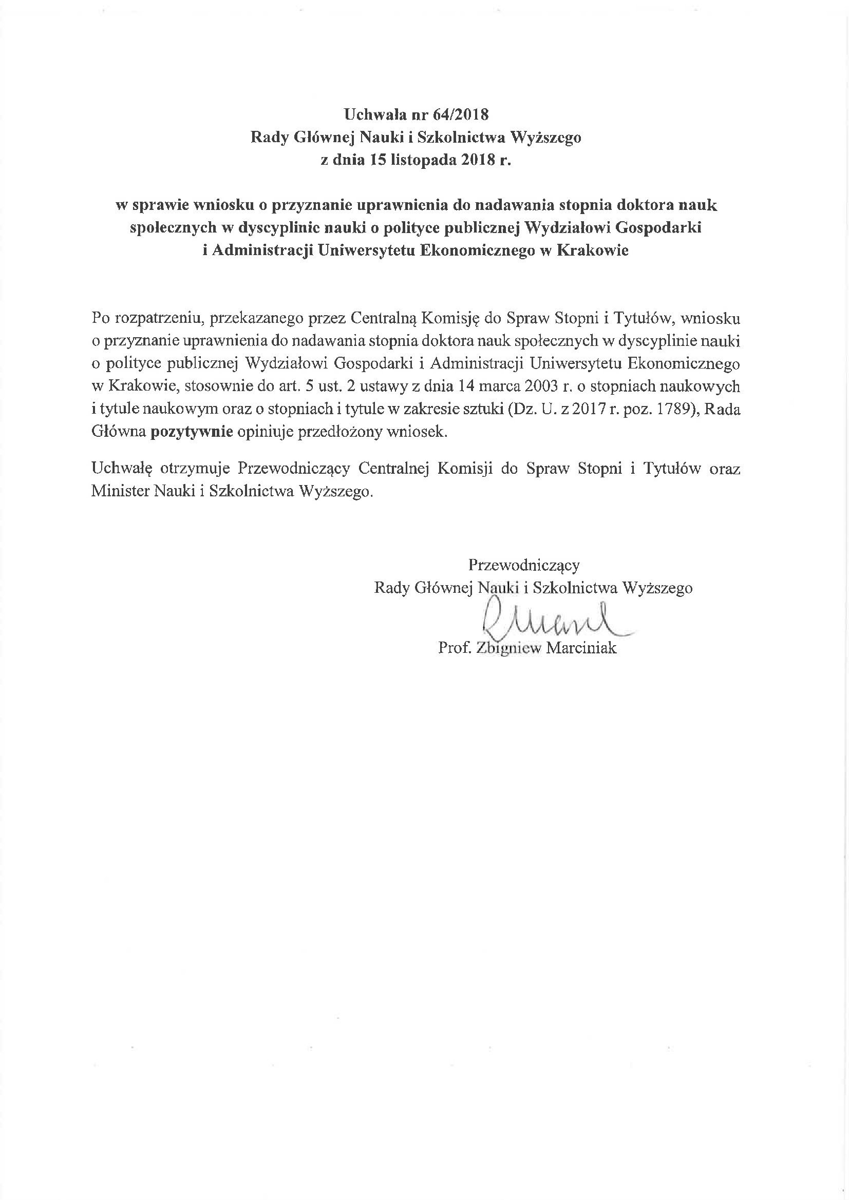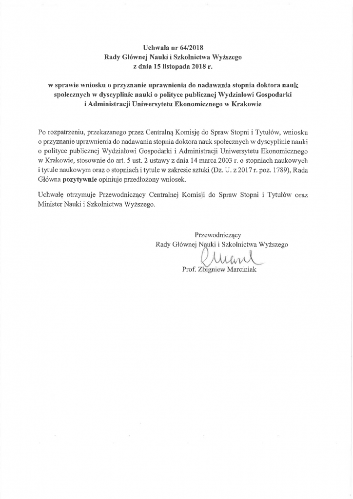 Uchwała nr 64/2018 Rady Głównej Nauki i Szkolnictwa Wyższego z dnia 15 listopada 2018 r. w sprawie wniosku o przyznanie uprawnienia do nadawania stopnia doktora nauk społecznych w dyscyplinie nauki o polityce publicznej Wydziałowi Gospodarki i Administracji Uniwersytetu Ekonomicznego w Krakowie