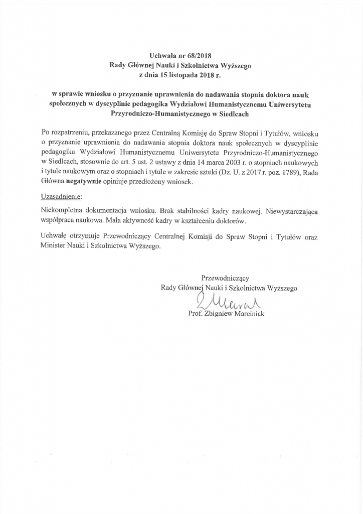 Uchwała nr 68/2018 Rady Głównej Nauki i Szkolnictwa Wyższego z dnia 15 listopada 2018 r. w sprawie wniosku o przyznanie uprawnienia do nadawania stopnia doktora nauk społecznych w dyscyplinie pedagogika Wydziałowi Humanistycznemu Uniwersytetu Przyrodniczo-Humanistycznego w Siedlcach