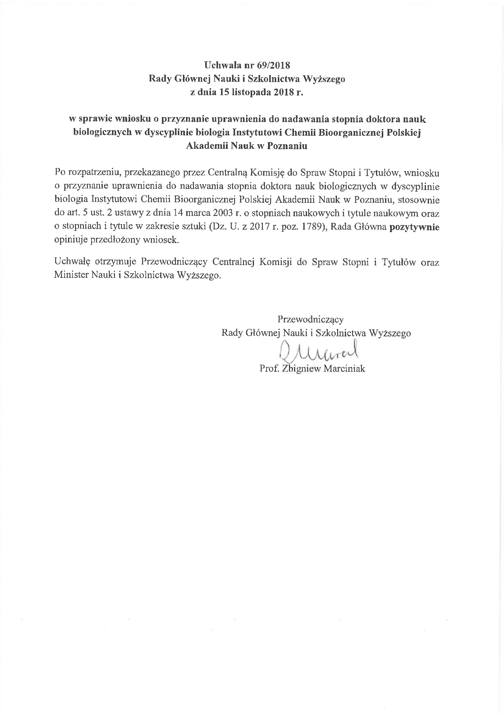 Uchwała nr 69/2018 Rady Głównej Nauki i Szkolnictwa Wyższego z dnia 15 listopada 2018 r. w sprawie wniosku o przyznanie uprawnienia do nadawania stopnia doktora nauk biologicznych w dyscyplinie biologia Instytutowi Chemii Bioorganicznej Polskiej Akademii Nauk w Poznaniu
