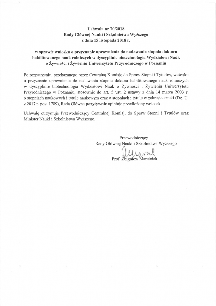 Uchwała nr 70/2018 Rady Głównej Nauki i Szkolnictwa Wyższego z dnia 15 listopada 2018 r. w sprawie wniosku o przyznanie uprawnienia do nadawania stopnia doktora habilitowanego nauk rolniczych w dyscyplinie biotechnologia Wydziałowi Nauk o Żywności i Żywieniu Uniwersytetu Przyrodniczego w Poznaniu