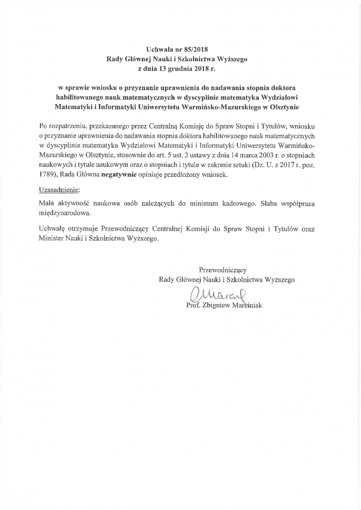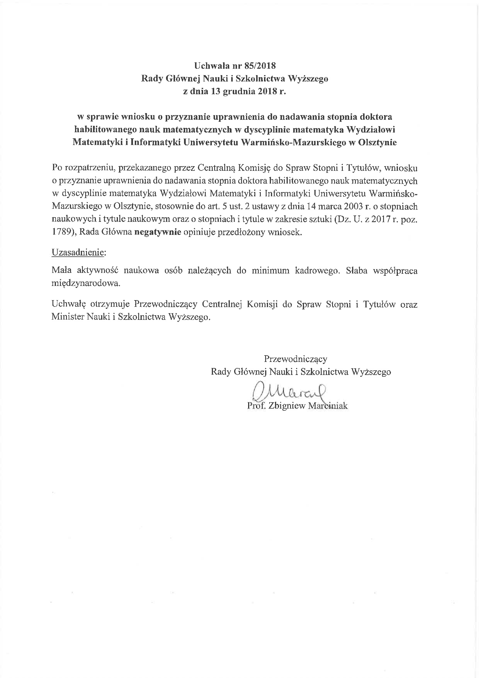 Uchwała nr 85/2018 Rady Głównej Nauki i Szkolnictwa Wyższego z dnia 13 grudnia 2018 r. w sprawie wniosku o przyznanie uprawnienia do nadawania stopnia doktora habilitowanego nauk matematycznych w dyscyplinie matematyka Wydziałowi Matematyki i Informatyki Uniwersytetu Warmińsko-Mazurskiego w Olsztynie