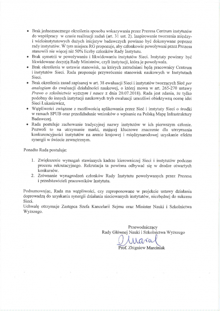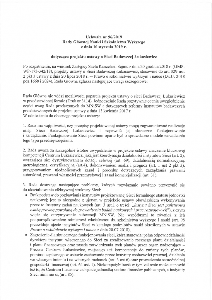 Uchwała nr 96/2019 Rady Głównej Nauki i Szkolnictwa Wyższego z dnia 10 stycznia 2019 r. dotycząca projektu ustawy o Sieci Badawczej Łukasiewicz