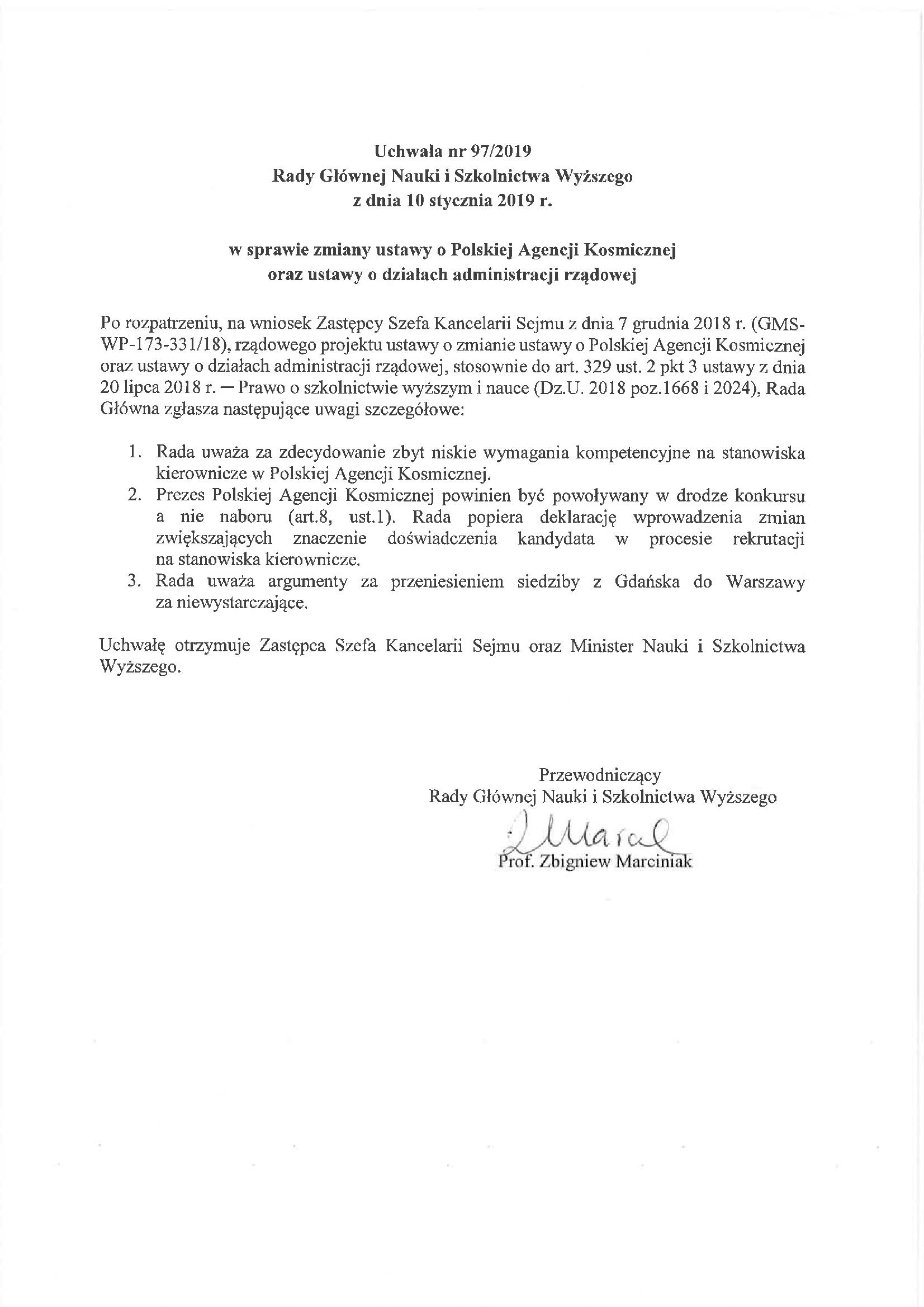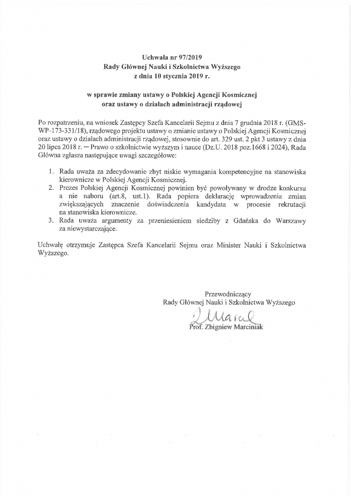 Uchwała nr 97/2019 Rady Głównej Nauki i Szkolnictwa Wyższego z dnia 10 stycznia 2019 r. w sprawie zmiany ustawy o Polskiej Agencji Kosmicznej oraz ustawy o działach administracji rządowej