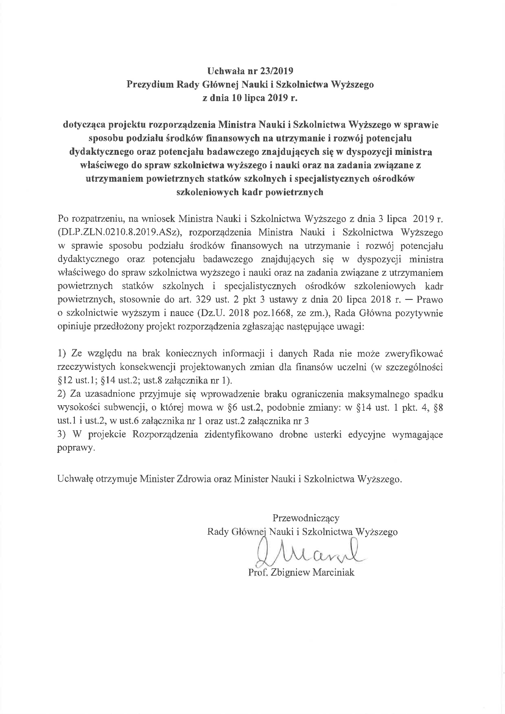 Uchwała nr 23/2019 Prezydium Rady Głównej Nauki i Szkolnictwa Wyższego z dnia 10 lipca 2019 r. dotycząca projektu rozporządzenia Ministra Nauki i Szkolnictwa Wyższego w sprawie sposobu podziału środków finansowych na utrzymanie i rozwój potencjału dydaktycznego oraz potencjału badawczego znajdujących się w dyspozycji ministra właściwego do spraw szkolnictwa wyższego i nauki oraz na zadania związane z utrzymaniem powietrznych statków szkolnych i specjalistycznych ośrodków szkoleniowych kadr powietrznych