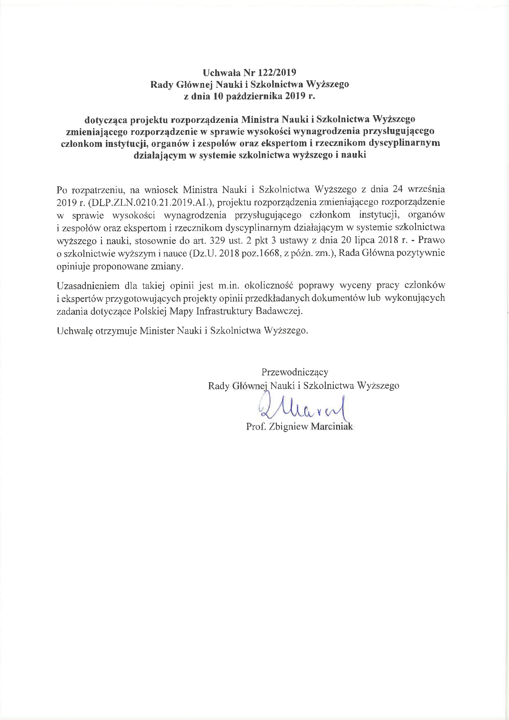 Uchwała Nr 122/2019 Rady Głównej Nauki i Szkolnictwa Wyższego z dnia 10 października 2019 r. dotycząca projektu rozporządzenia Ministra Nauki i Szkolnictwa Wyższego zmieniającego rozporządzenie w sprawie wysokości wynagrodzenia przysługującego członkom instytucji, organów i zespołów oraz ekspertom i rzecznikom dyscyplinarnym działającym w systemie szkolnictwa wyższego i nauki