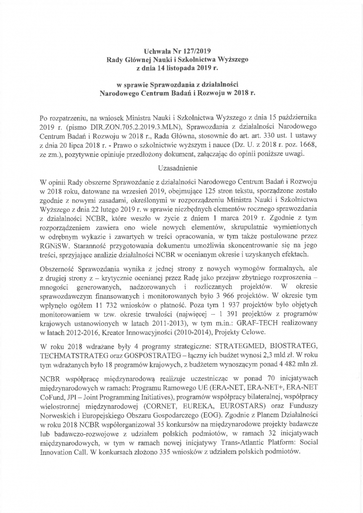 Uchwała Nr 127/2019 Rady Głównej Nauki i Szkolnictwa Wyższego z dnia 14 listopada 2019 r. w sprawie Sprawozdania z działalności Narodowego Centrum Badań i Rozwoju w 2018 r.