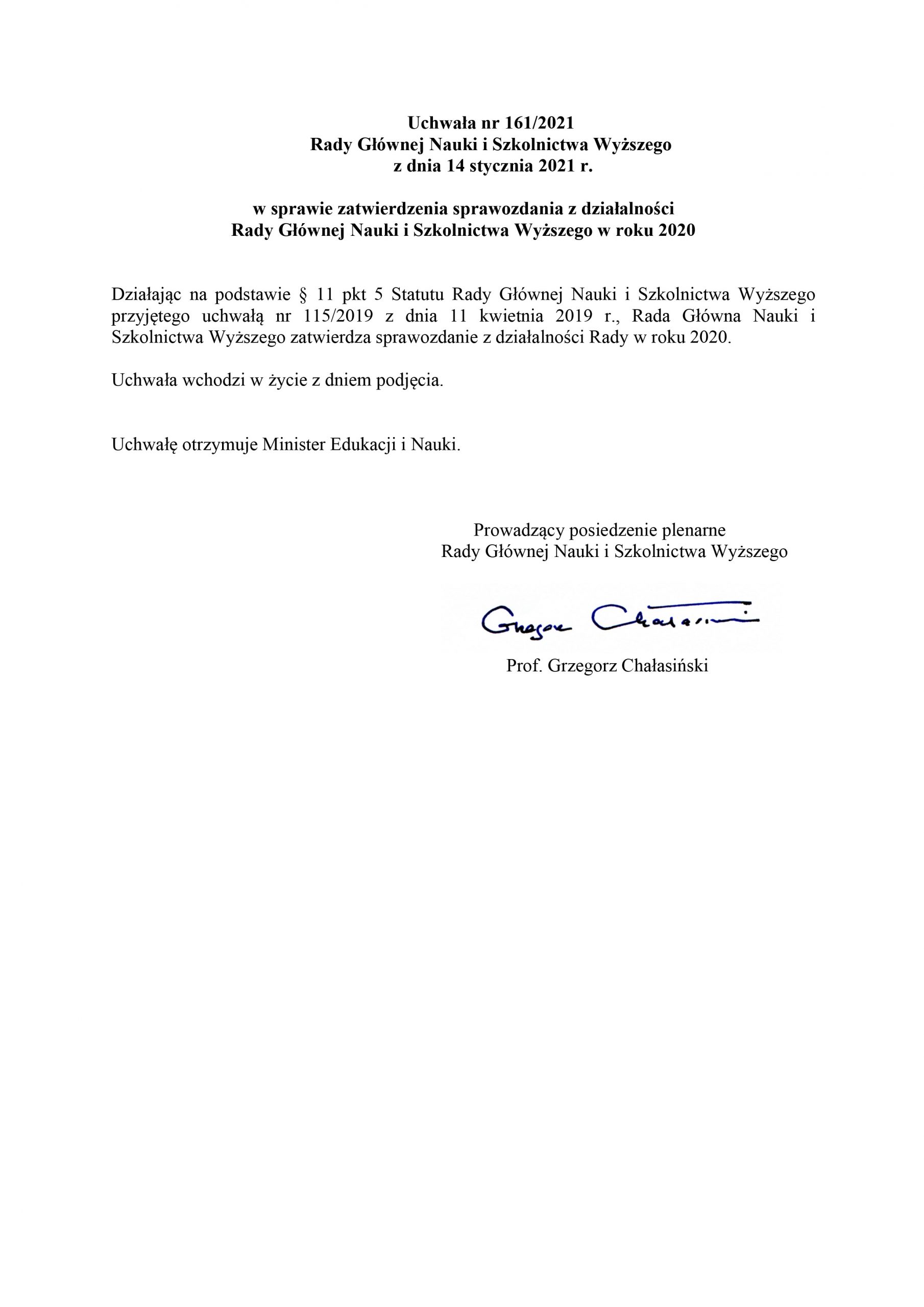 Uchwała nr 161/2021 Rady Głównej Nauki i Szkolnictwa Wyższego z dnia 14 stycznia 2021 r. w sprawie zatwierdzenia sprawozdania z działalności Rady Głównej Nauki i Szkolnictwa Wyższego w roku 2020