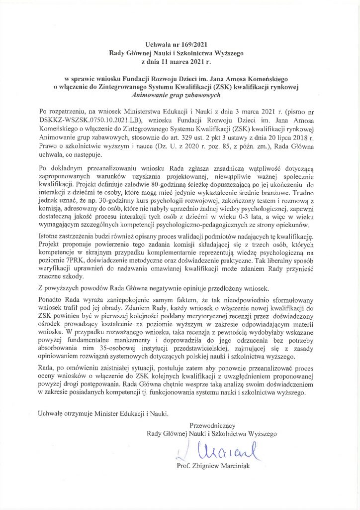 Uchwała nr 169/2021 Rady Głównej Nauki i Szkolnictwa Wyższego z dnia 11 marca 2021 r. w sprawie wniosku Fundacji Rozwoju Dzieci im. Jana Amosa Komeńskiego o włączenie do Zintegrowanego Systemu Kwalifikacji (ZSK) kwalifikacji rynkowej Animowanie grup zabawowych