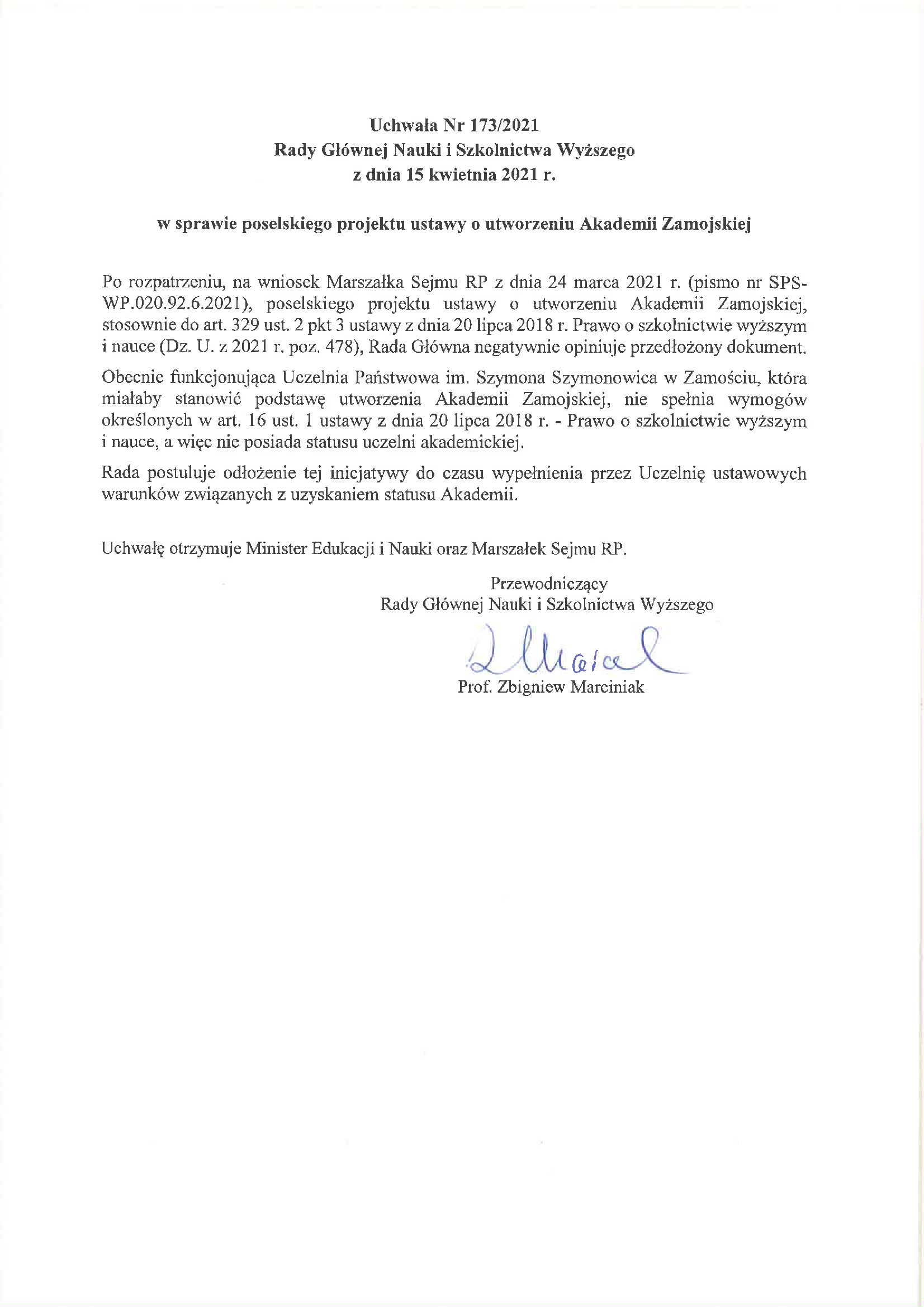 Uchwała Nr 173/2021 Rady Głównej Nauki i Szkolnictwa Wyższego z dnia 15 kwietnia 2021 r. w sprawie poselskiego projektu ustawy o utworzeniu Akademii Zamojskiej