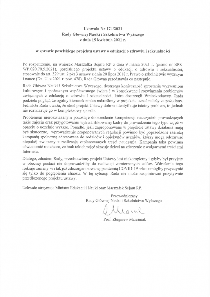 Uchwała Nr 174/2021 Rady Głównej Nauki i Szkolnictwa Wyższego z dnia 15 kwietnia 2021 r. w sprawie poselskiego projektu ustawy o edukacji o zdrowiu i seksualności