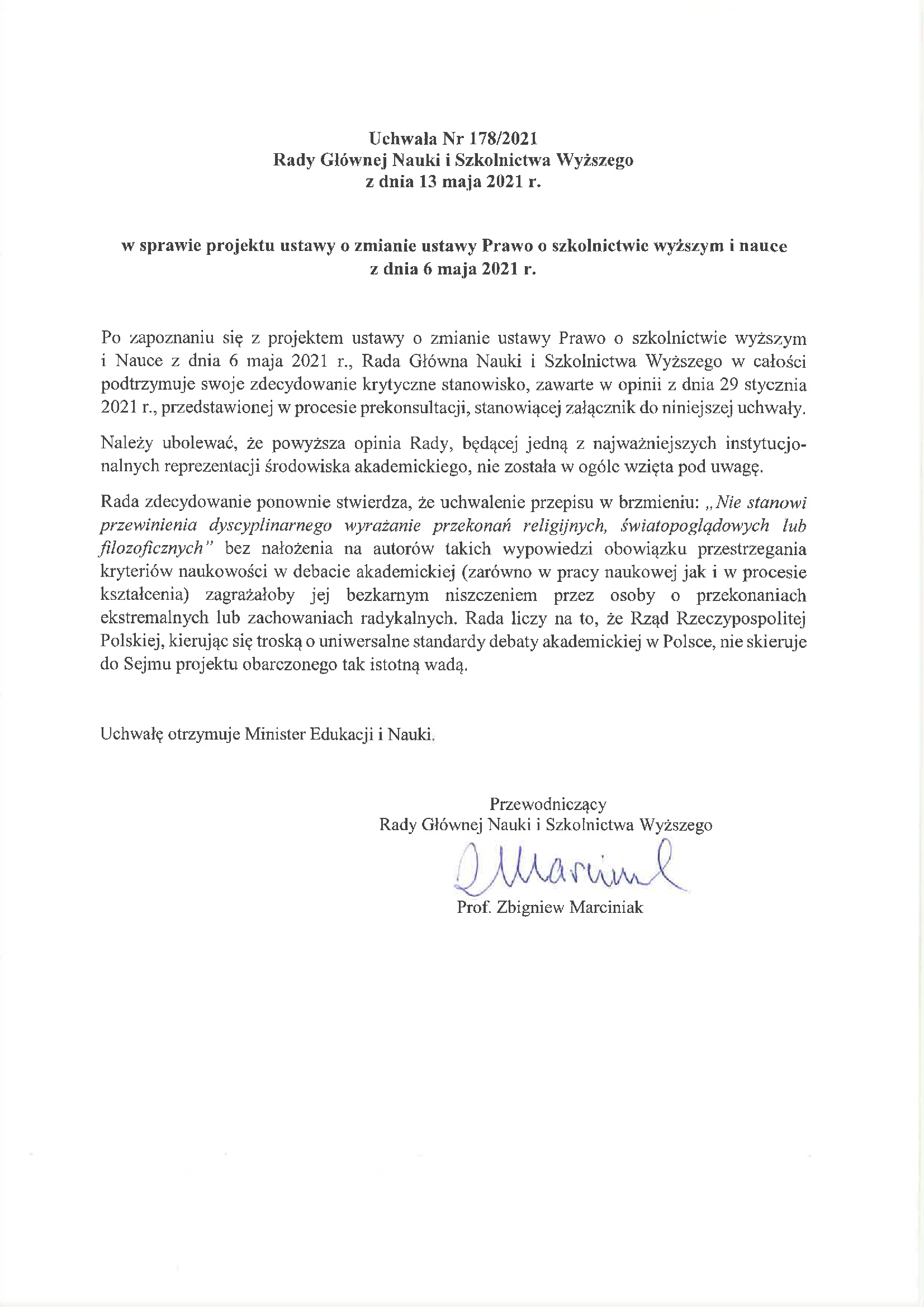 Uchwała Nr 178/2021 Rady Głównej Nauki i Szkolnictwa Wyższego z dnia 13 maja 2021 r. w sprawie projektu ustawy o zmianie ustawy Prawo o szkolnictwie wyższym i nauce z dnia 6 maja 2021 r.