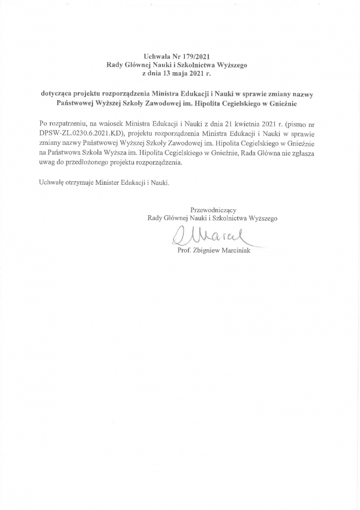 Uchwała Nr 179/2021 Rady Głównej Nauki i Szkolnictwa Wyższego z dnia 13 maja 2021 r. dotycząca projektu rozporządzenia Ministra Edukacji i Nauki w sprawie zmiany nazwy Państwowej Wyższej Szkoły Zawodowej im. Hipolita Cegielskiego w Gnieźnie