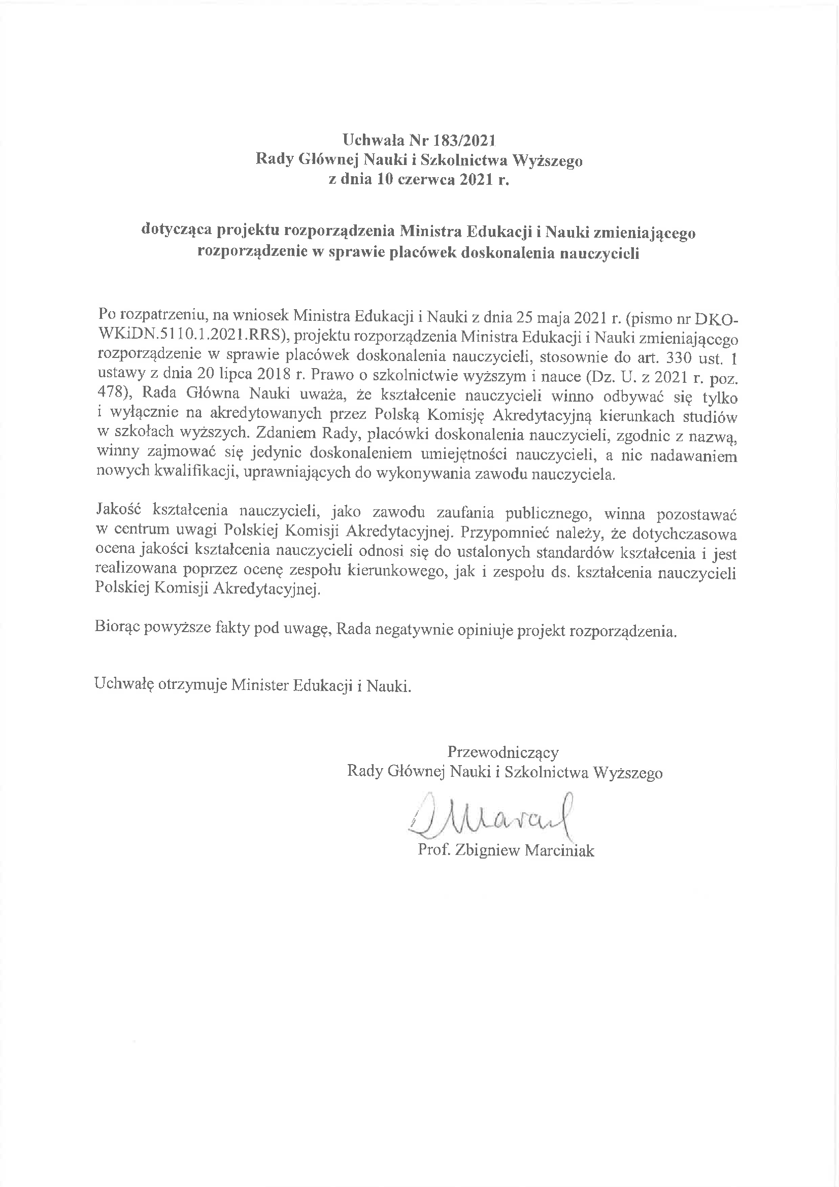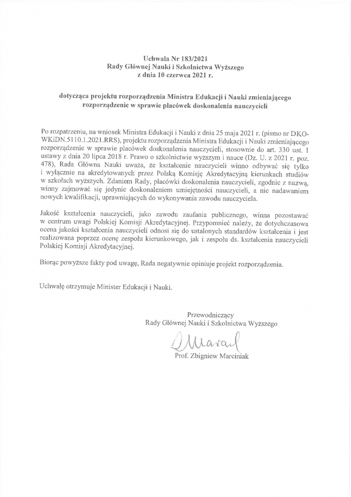 Uchwała Nr 183/2021 Rady Głównej Nauki i Szkolnictwa Wyższego z dnia 10 czerwca 2021 r. dotycząca projektu rozporządzenia Ministra Edukacji i Nauki zmieniającego rozporządzenie w sprawie placówek doskonalenia nauczycieli