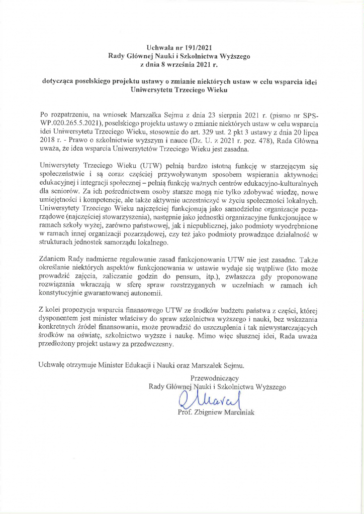 Uchwała nr 191/2021 Rady Głównej Nauki i Szkolnictwa Wyższego z dnia 8 września 2021 r. dotycząca poselskiego projektu ustawy o zmianie niektórych ustaw w celu wsparcia idei Uniwersytetu Trzeciego Wieku