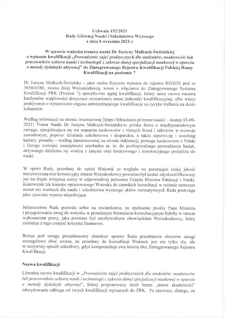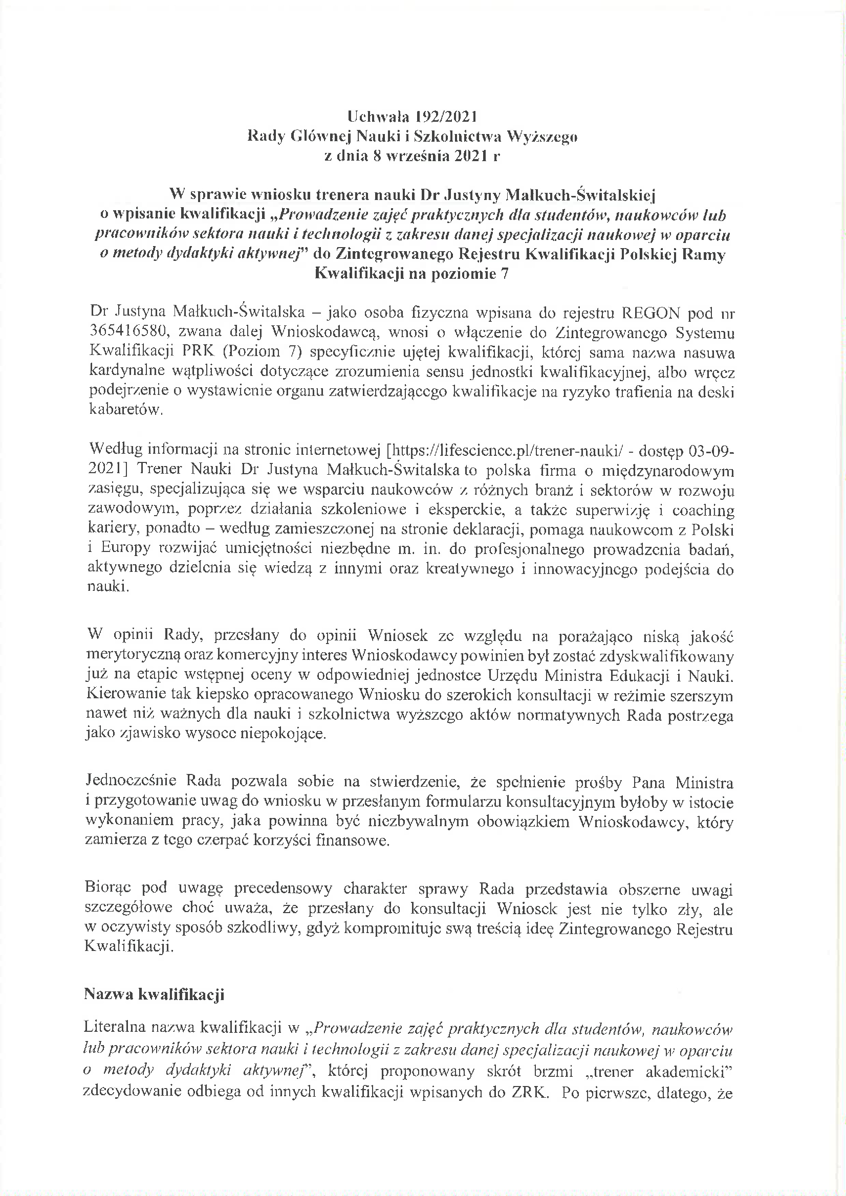 Uchwała nr 192/2021 Rady Głównej Nauki i Szkolnictwa Wyższego z dnia 8 września 2021 r. w sprawie wniosku trenera nauki Dr Justyny Małkuch-Świtalskiej o wpisanie kwalifikacji „Prowadzenie zajęć praktycznych dla studentów, naukowców lub pracowników sektora nauki i technologii z zakresu danej specjalizacji naukowej w oparciu o metody dydaktyki aktywnej” do Zintegrowanego Rejestru Kwalifikacji Polskiej Ramy Kwalifikacji na poziomie 7