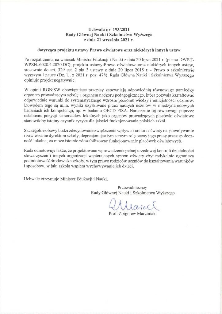 Uchwała nr 193/2021 Rady Głównej Nauki i Szkolnictwa Wyższego z dnia 21 września 2021 r. dotycząca projektu ustawy Prawo oświatowe oraz niektórych innych ustaw